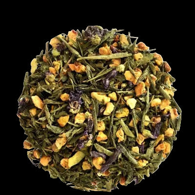 Ingrédients : thé vert (59%), pomme, noix de coco grillés, matcha (1%), chips de noix de coco, fleurs de mauve.